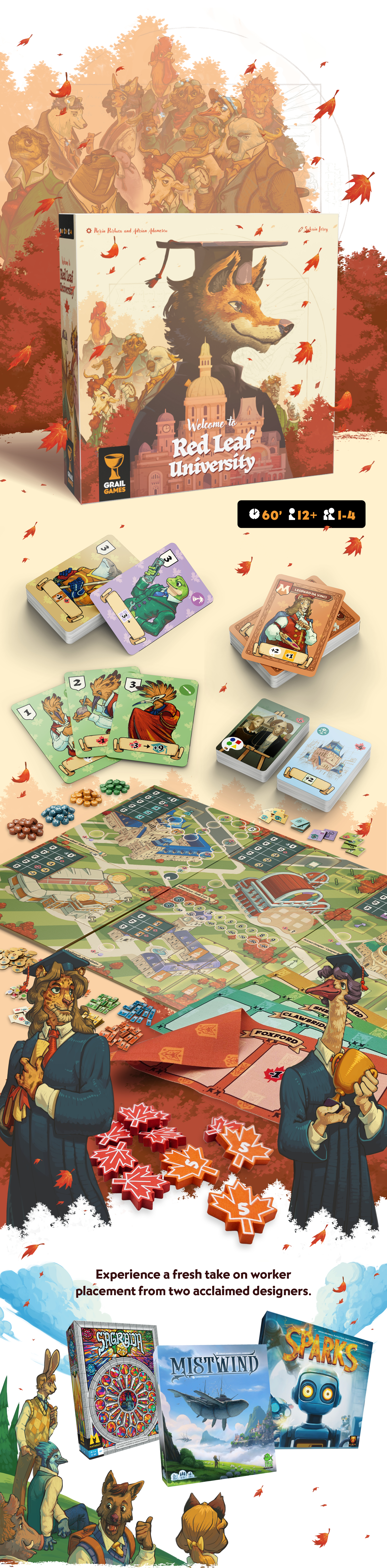 Red Leaf University is the latest creation by Adrian Adamescu (Sagrada, Mistwind, Sparks…) and Florin Purluca (Sparks). The game offers an original take on worker placement and worker improvement mechanics, woven into a distinctive theme of anthropomorphic students, and brought to life by dozens of illustrations by Sylvain Leroy.